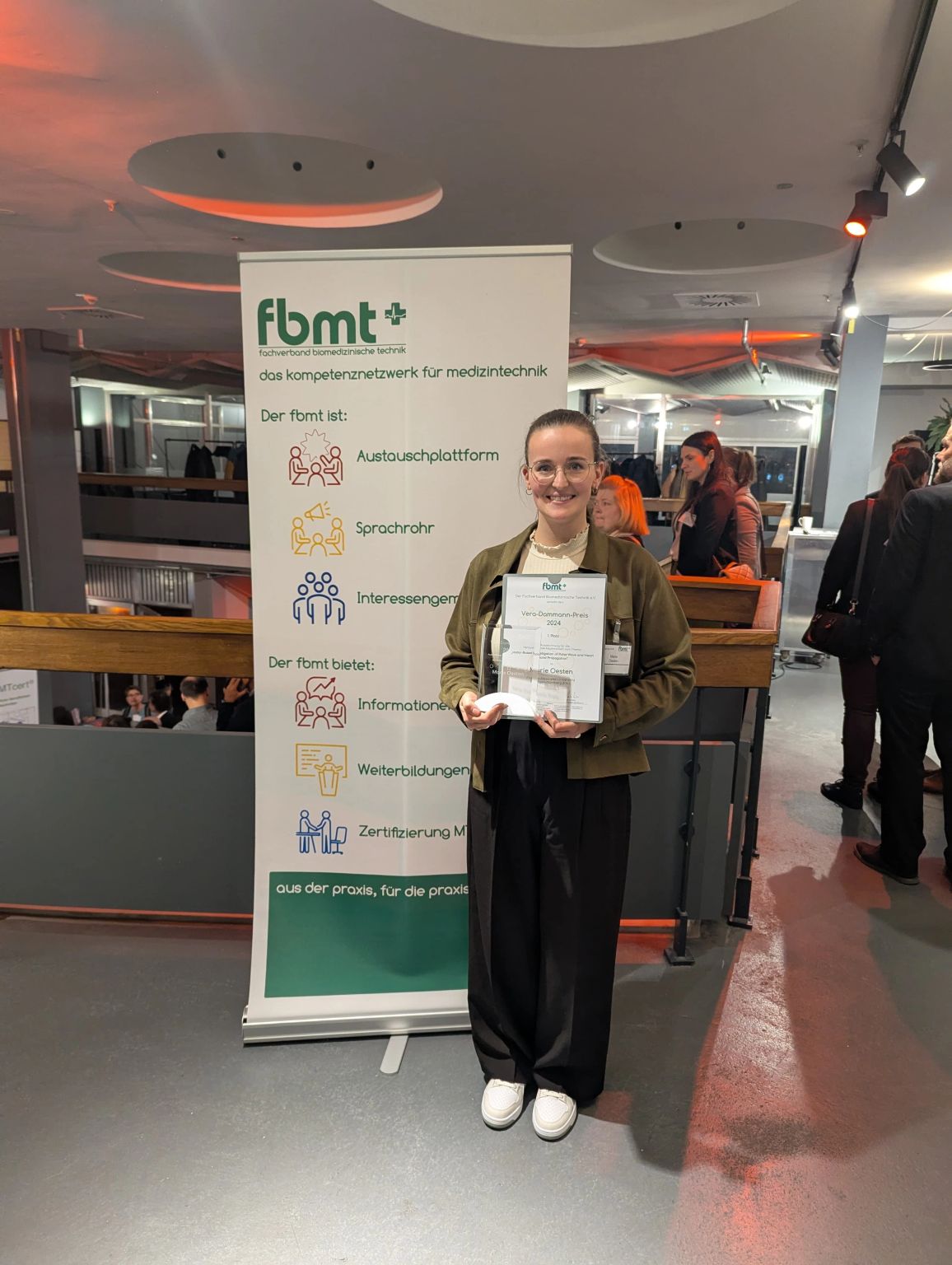 We are pleased to announce that Marie Oesten, a doctoral researcher in subproject D05, has received the Vera-Dammann-Prize 2024 for her Master’s Thesis titled ‚Radar-Based Investigation of Pulse Wave and Heart Sound Propagation.‘ The award was presented on November 13th and 14th in Leipzig by the Fachverband Biomedizinische Technik (fbmt) e.V. During their annual conference, Marie also had the opportunity to present the key findings of her research.